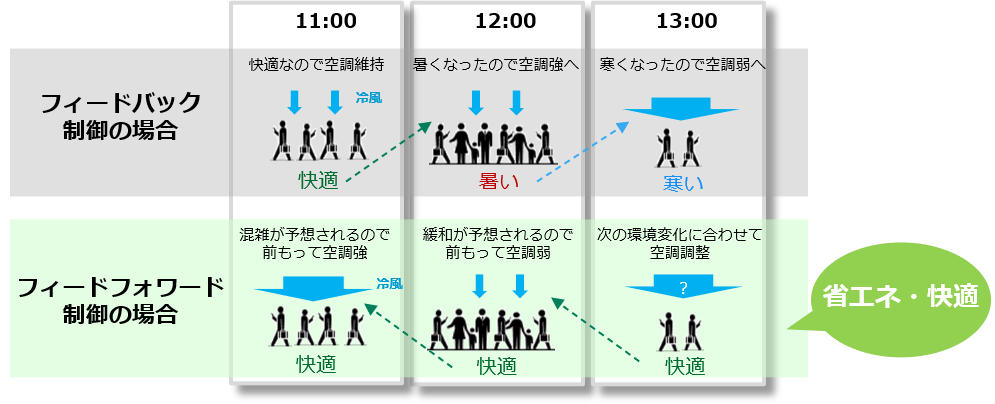 共用部のような大空間では、空調を効かせ始めてから効くまでに時間がかかってしまいます。暑くなってから空調を強めて冷やし始めても冷えるまでに時間がかかるうえ、そのまま冷やし続けて冷やしすぎてしまうこともあります。